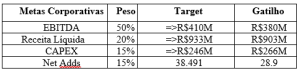 - Caso o resultado da meta de EBITDA fique abaixo de R$380M, não haverá pagamento de PPR.