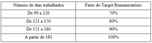 - Para os trabalhadores admitidos no exercício de 2025, a partir de 90 (noventa) dias completos e até completarem 180 (cento e oitenta) dias, a contar da data de admissão, os trabalhadores são elegíveis à proporcionalidade do Target Remuneratório, tratado na cláusula décima deste acordo, conforme tabela a seguir: