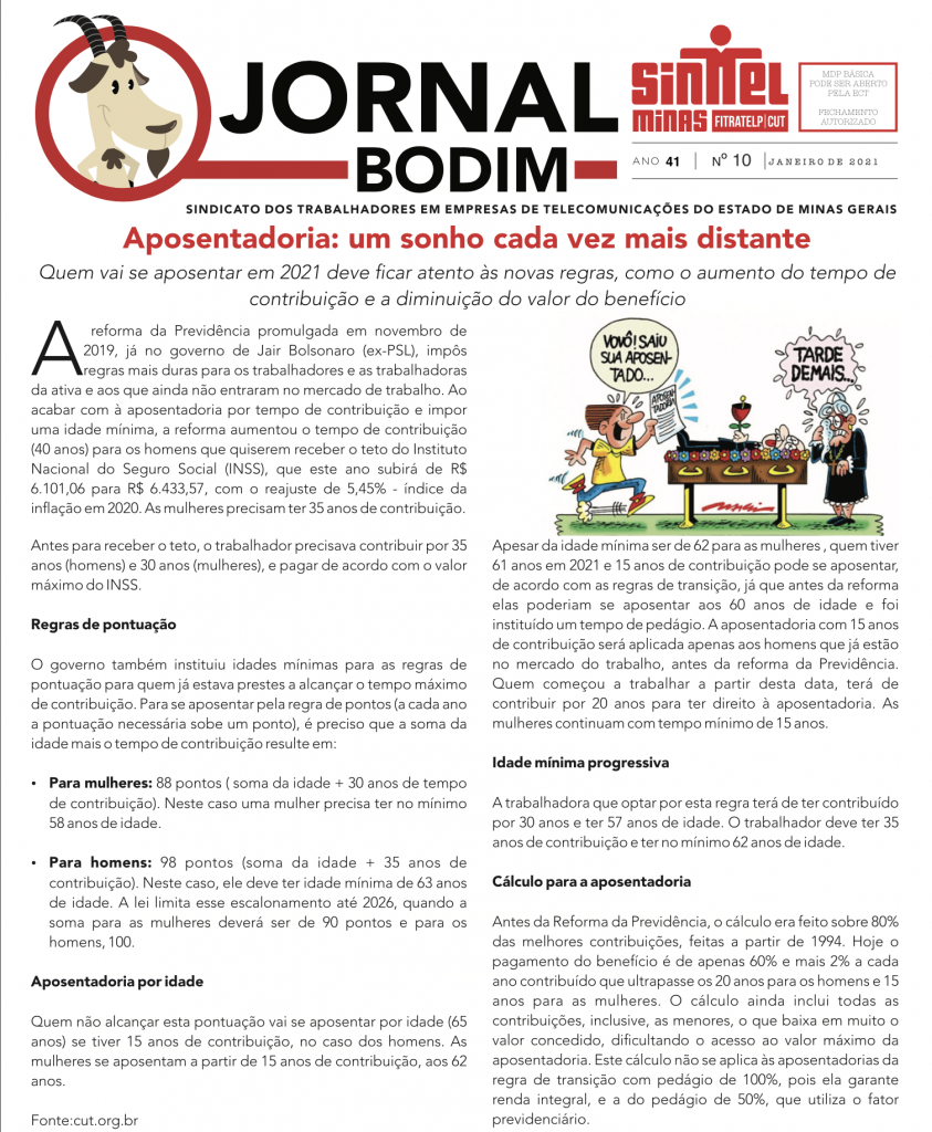 JORNAL JANEIRO – APOSENTADORIA: UM SONHO CADA VEZ MAIS DISTANTE Version Download 37 Tamanho do Arquivo 30.20 MB File Count 1 Data de Criação 29 de janeiro de 2021 Ultima Atualização 29 de janeiro de 2021 Download Description