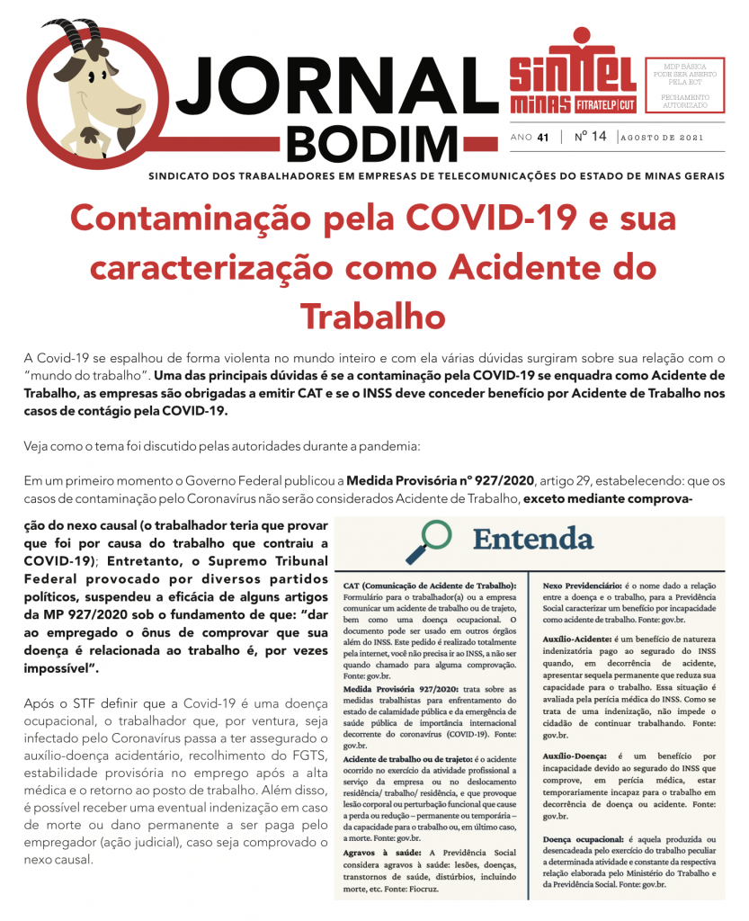 Contaminação pela COVID-19 e sua caracterização como Acidente do Trabalho Download Download is available until [expire_date] Version Download 20 Tamanho do Arquivo 44.93 MB File Count 1 Data de Criação 30 de julho de 2021 Ultima Atualização 5 de agosto de 2021Contaminação pela COVID-19 e sua caracterização como Acidente do Trabalho