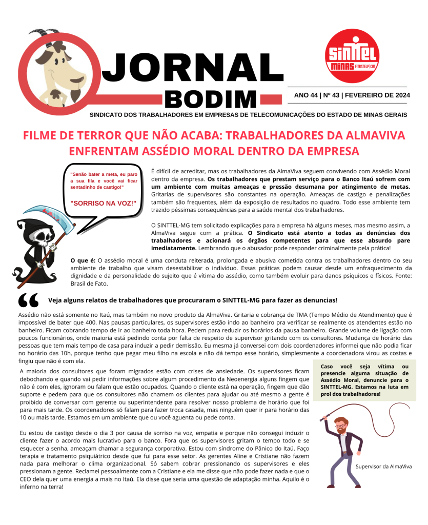 FILME DE TERROR QUE NÃO ACABA: TRABALHADORES DA ALMAVIVA ENFRENTAM ASSÉDIO MORAL DENTRO DA EMPRESA Download Download is available until [expire_date] Version Download 28 Tamanho do Arquivo 4.31 MB File Count 1 Data de Criação 8 de fevereiro de 2024 Ultima Atualização 8 de fevereiro de 2024FILME DE TERROR QUE NÃO ACABA: TRABALHADORES DA ALMAVIVA ENFRENTAM ASSÉDIO MORAL DENTRO DA EMPRESA