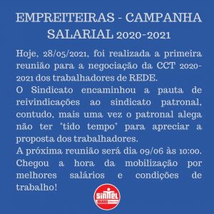 EMPREITEIRAS – CAMPANHA SALARIAL 2020-2021Notícias / Por admin / 28 de maio de 2021 28 de maio de 2021