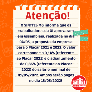 O SINTTEL-MG informa que os trabalhadores da OI aprovaram em Assembleia, realizada no dia 04/05, a proposta da empresa para o Placar 2021 e 2022. O valor corresponde a 0,14% (referente ao Placar 2021) e o adiantamento de 0,86% (referente ao Placar 2022) do salário nominal de 01/05/2022. Ambos serão pagos no dia 13/05/2022!